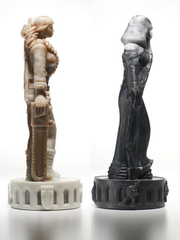Since the queen is the most powerful piece on the board, these had to be intimidating and brutal, but keep their femininity. The 'Redneck' is armed with a chainsaw, wooden stakes, strip of shotgun shells, and a shotgun concealed behind her back. 'Death' counters by... well... being 'Death'...also, I don't mean to offend with the term 'redneck'. I just like the image of a country girl, sporting a trucker cap and jean shorts, but armed like Bruce Campbell.